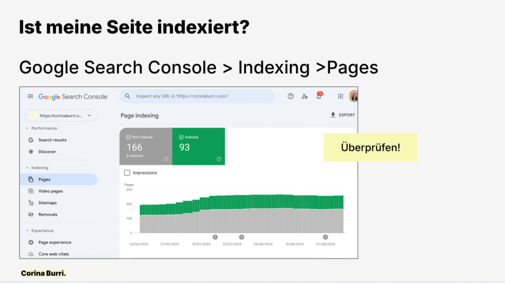 . Bei kleinen Seiten siehst du damit grob, wie viele Seiten Google kennt. Für grössere Seiten nutze ich die Google Search Console, dort unter Index → Seiten. Hier findest du eine detaillierte Übersicht, welche Seiten indexiert sind, welche ausgeschlossen wurden – und warum.