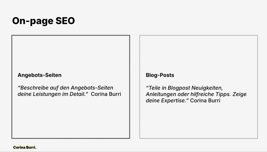 Eine Webseite braucht Text. Das ist wichtig. Denn Google muss verstehen, um was es bei deiner Webseite geht. Am allerwichtigsten ist, dass du dein Angebot beschreibst. Damit Personen, die nach deinem Service suchen, dich auch finden. Es empfiehlt sich hier, mit einer Keyword-Recherche zu beginnen. Somit weisst du wie die Nutzer*innen dein Angebot nennen.